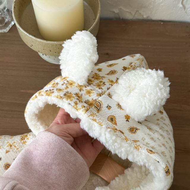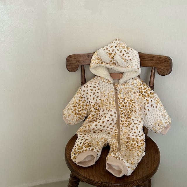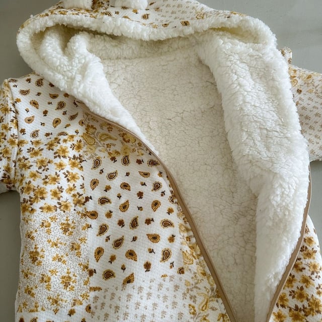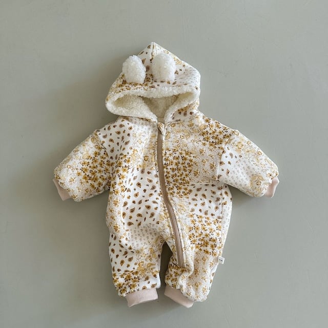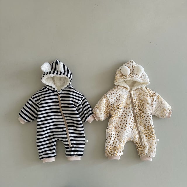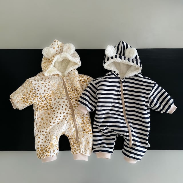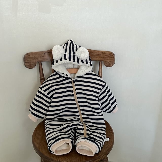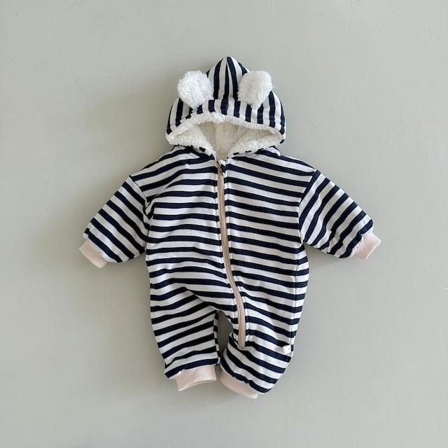 【BABY】裏起毛暖かいボーダー帽子付きロンパース