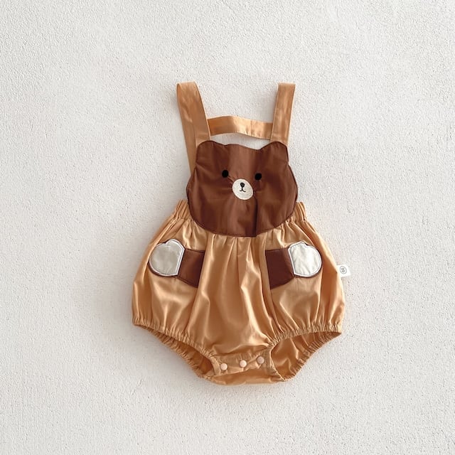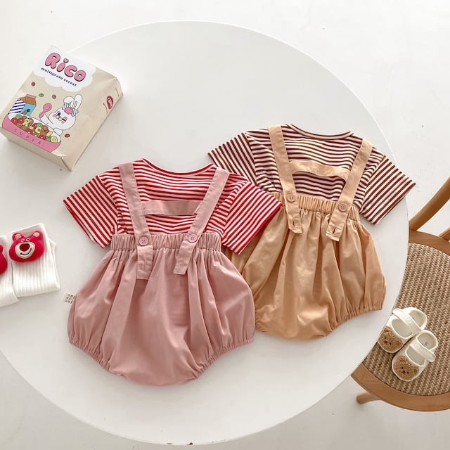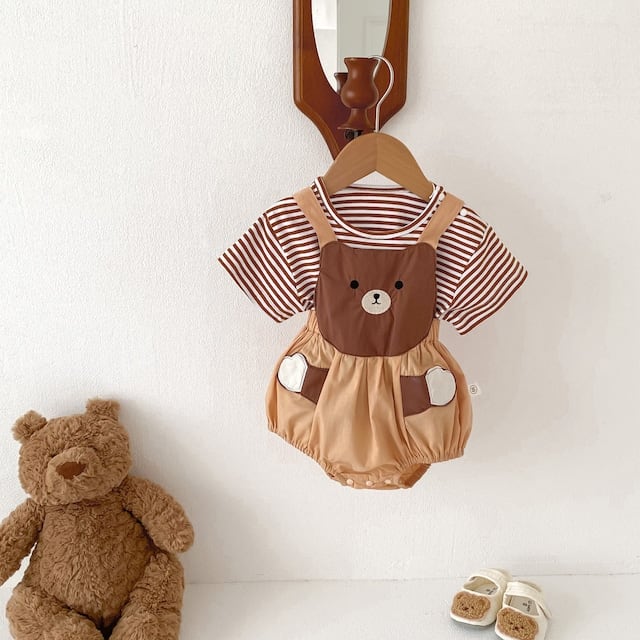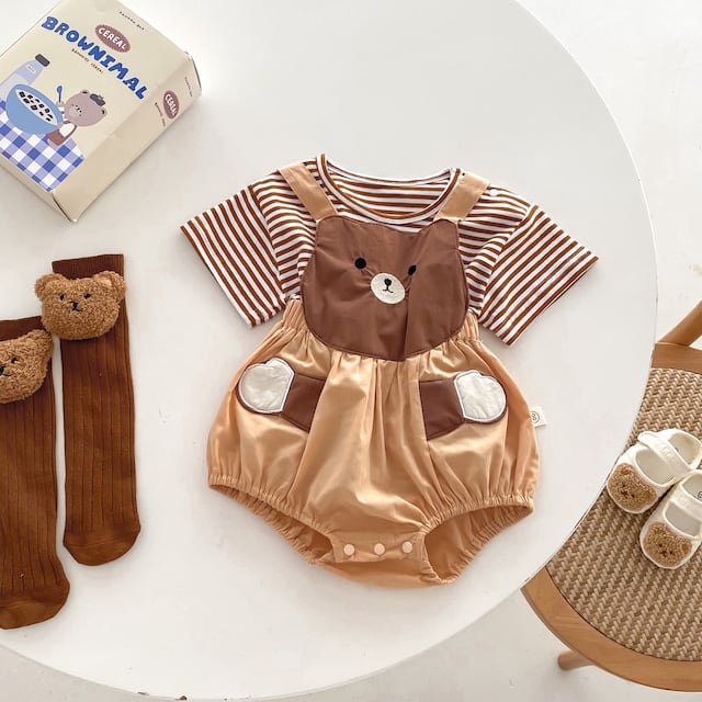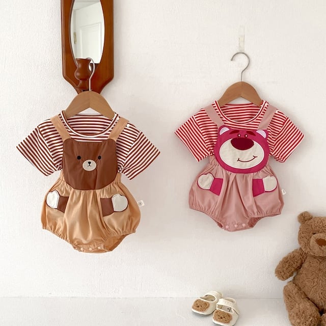 【2点セット】夏新作 可愛いクマサロペット&ボーダーTシャツ