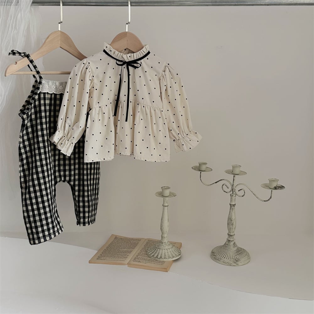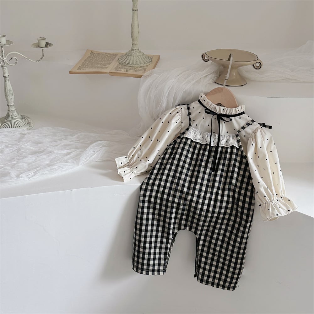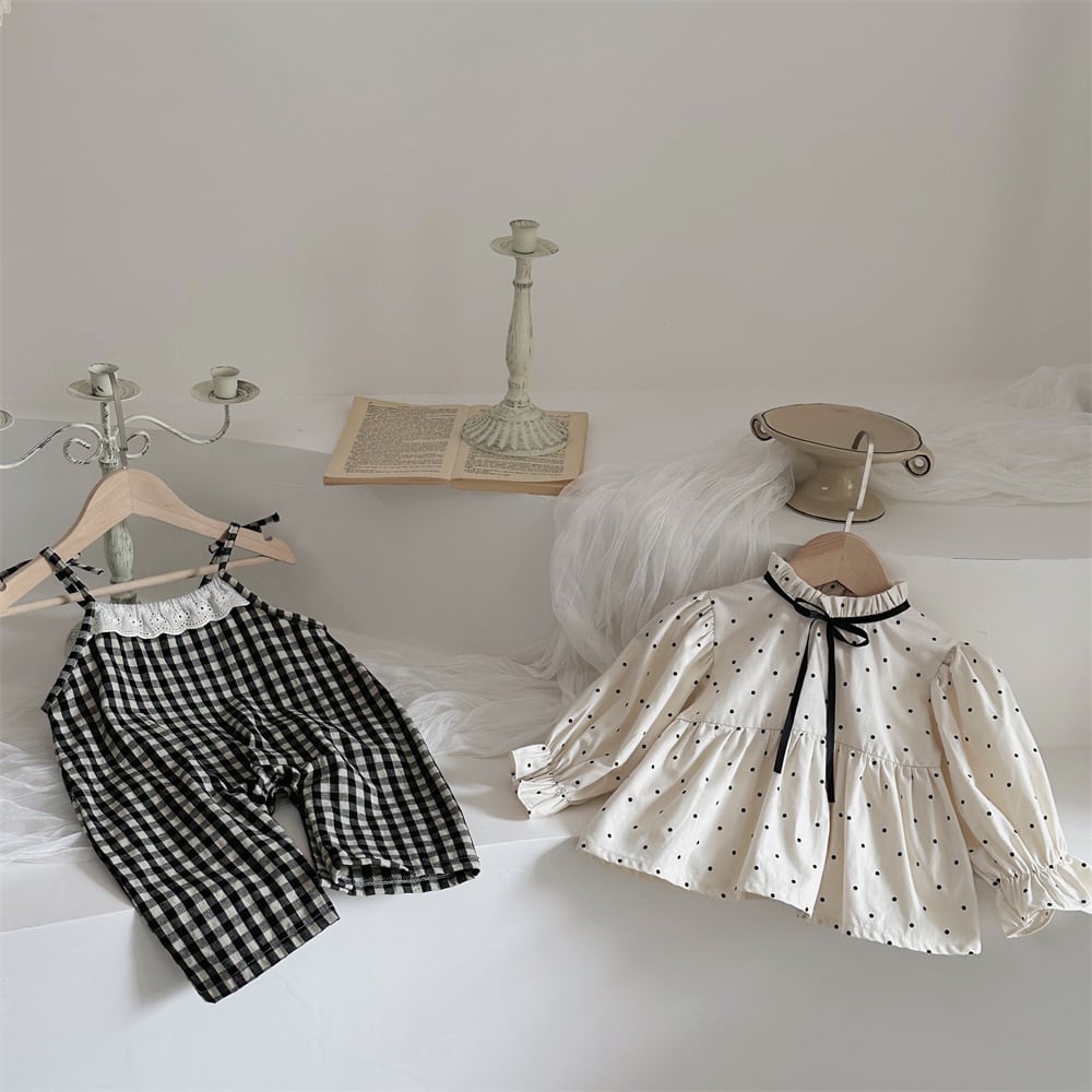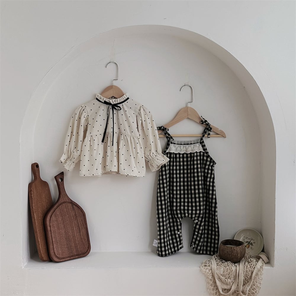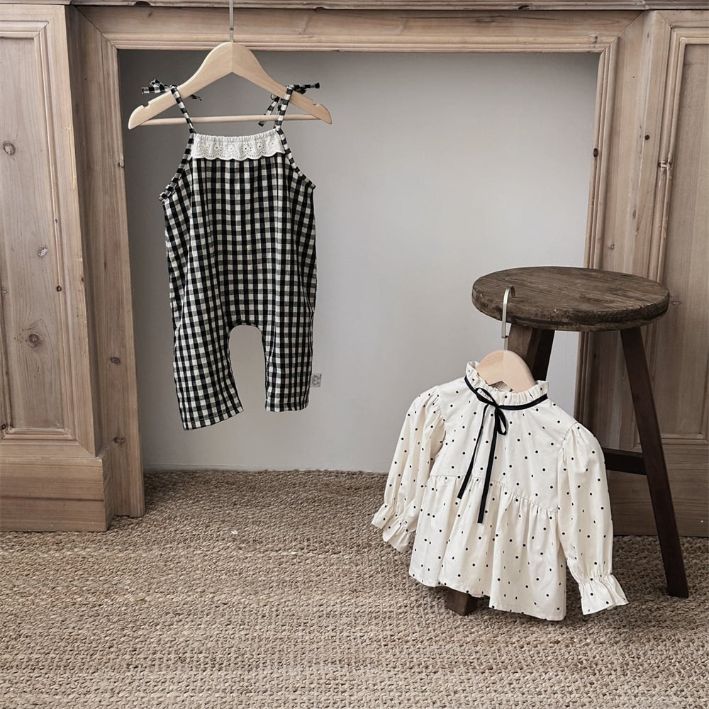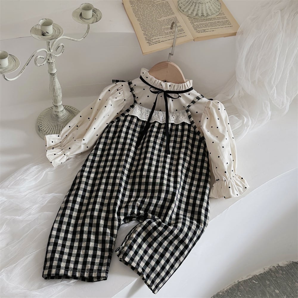 【BABY】秋新作 チェック柄サロペット ドットシャツ