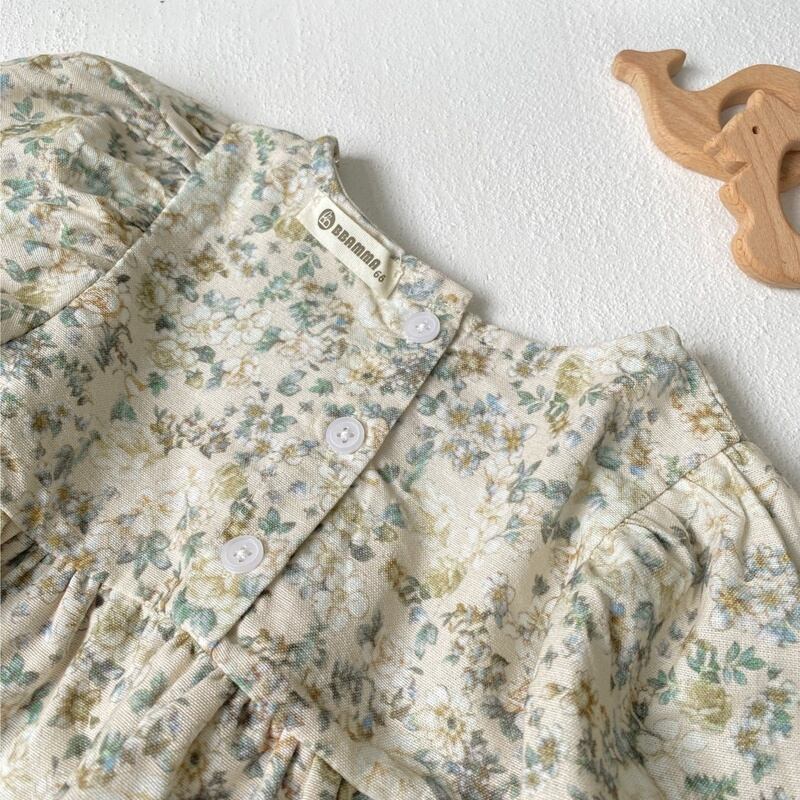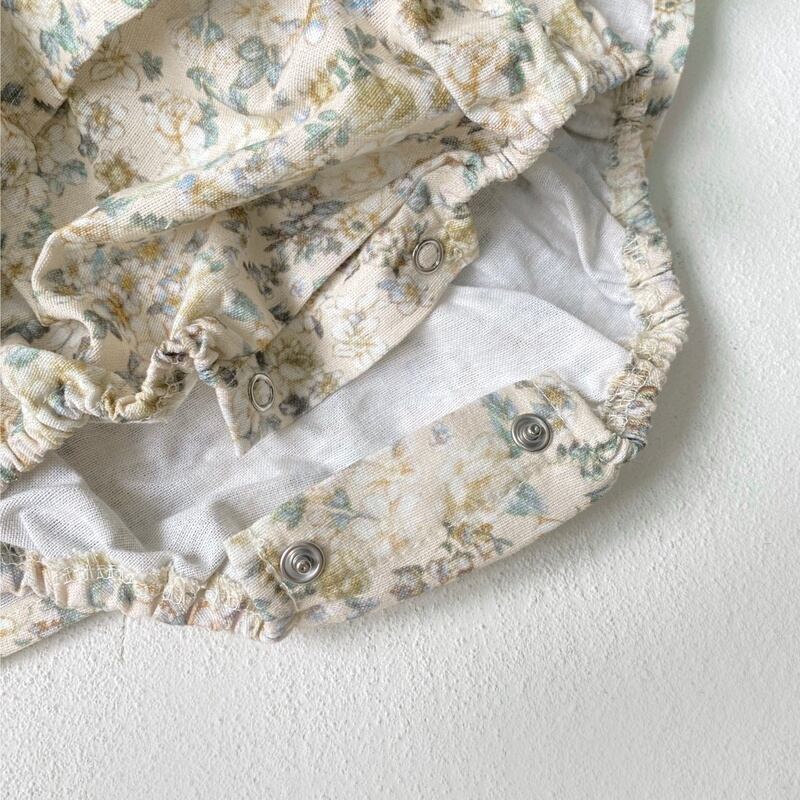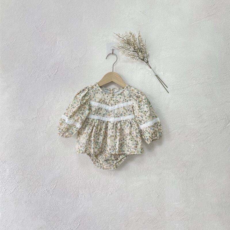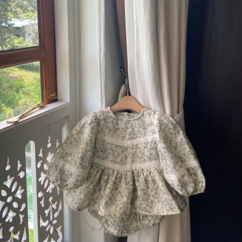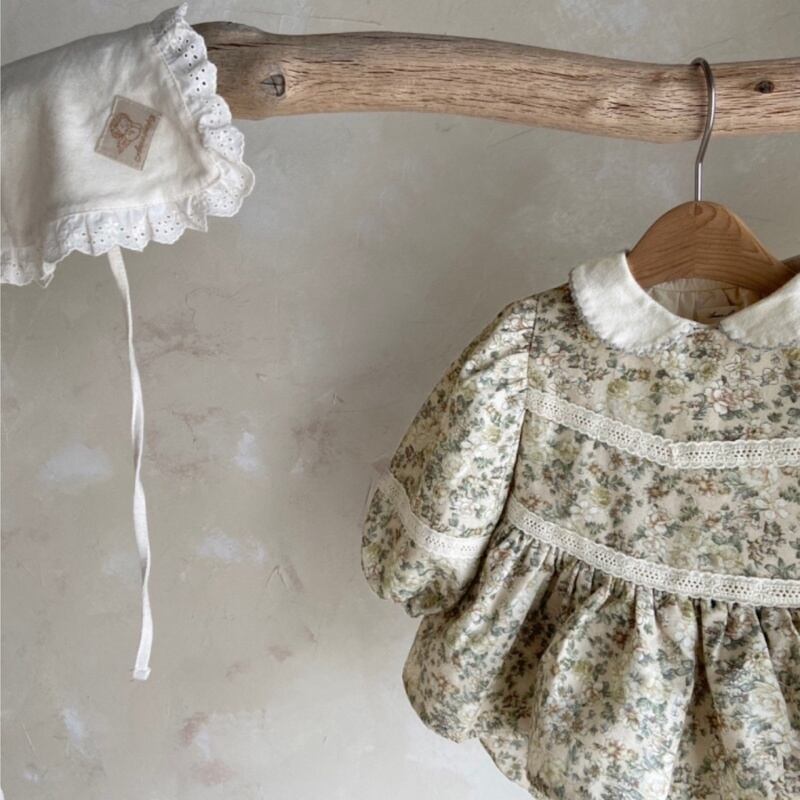【BABY】秋新作 レトログリーン花ロンパース
