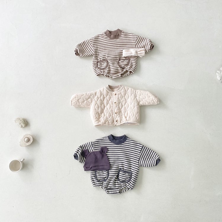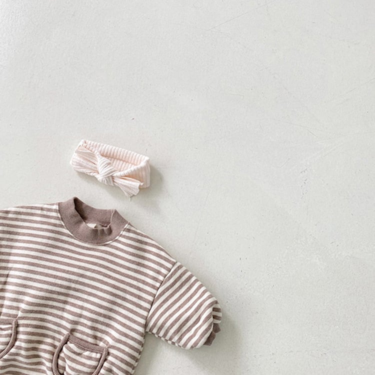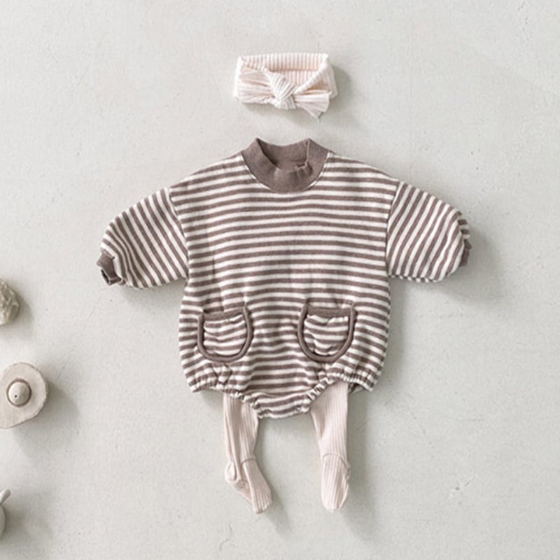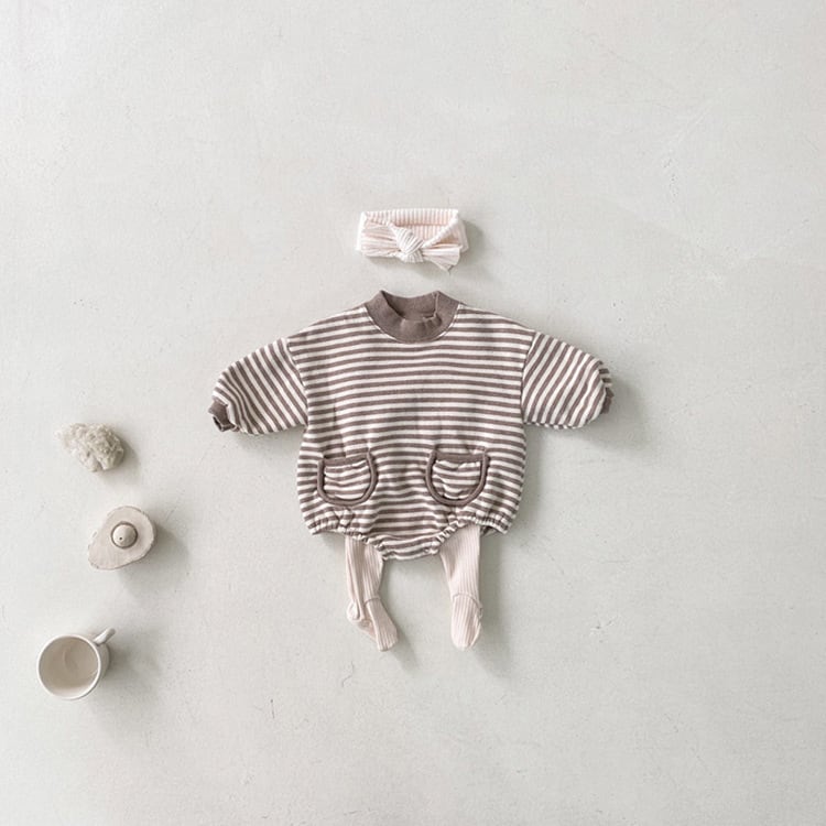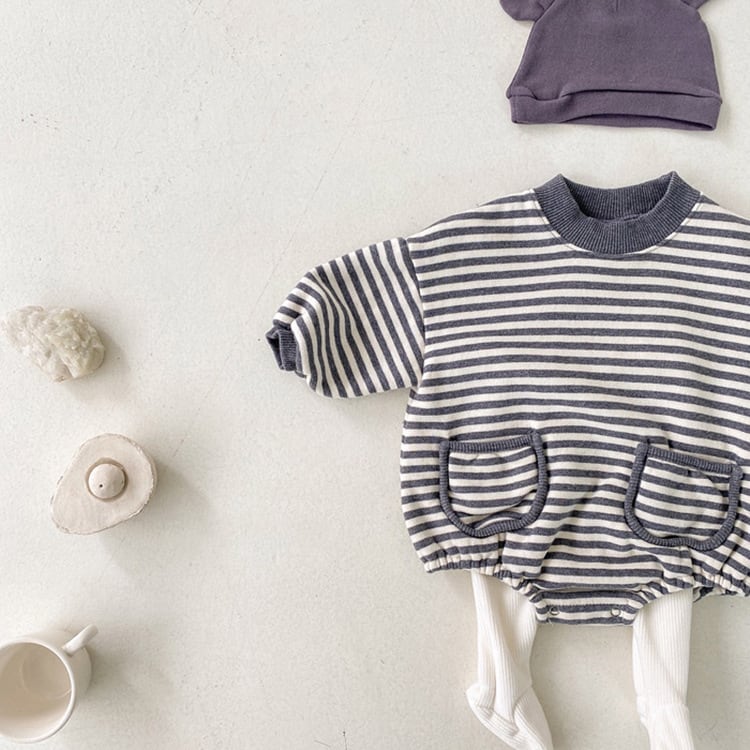 【BABY】韓国風 ボーダーポケット付きロンパース